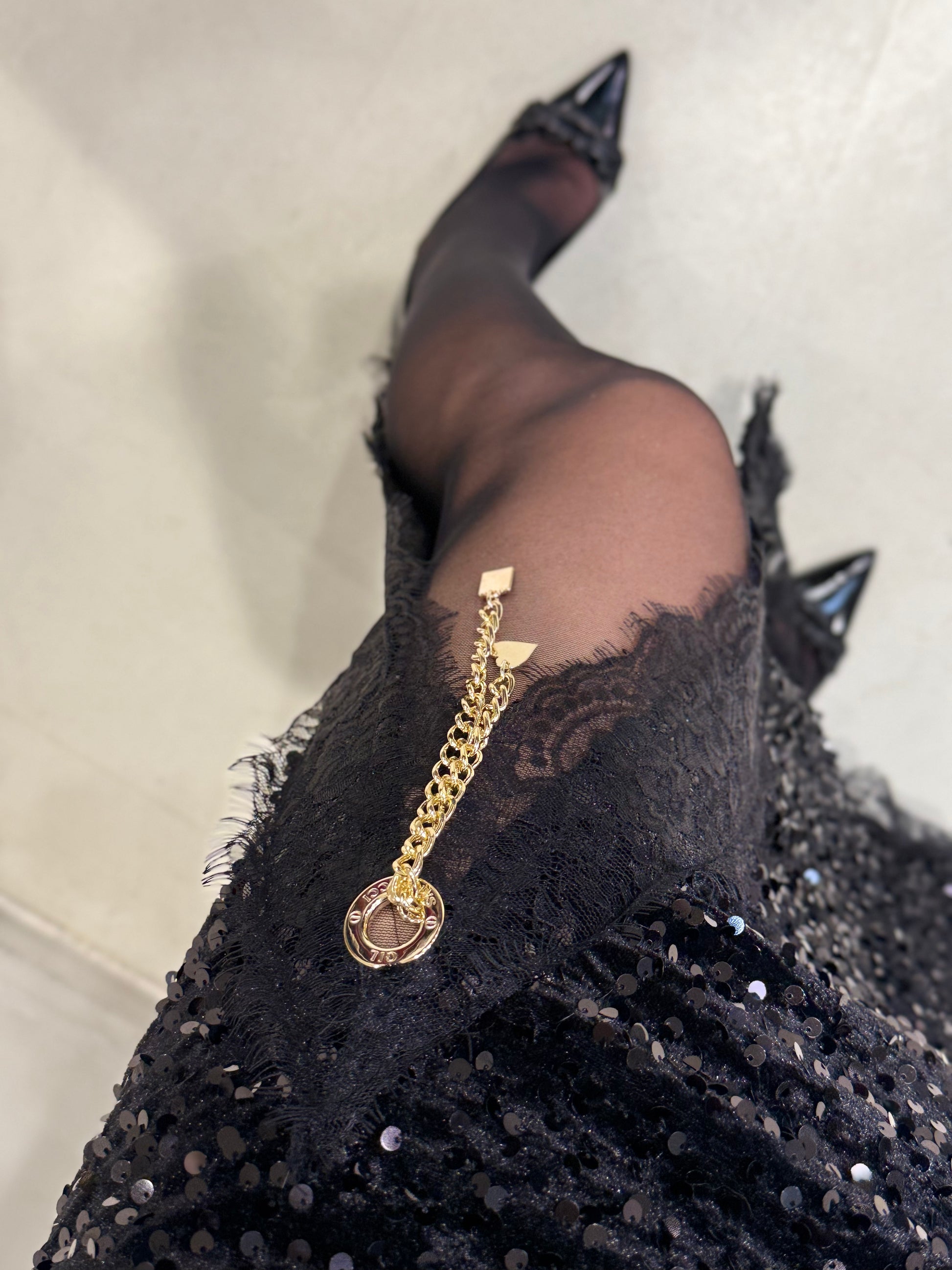 Abito nero festivo elegante, impreziosito da paillettes che catturano la luce per un effetto scintillante. Perfetto per occasioni speciali, cene e eventi, questo capo combina sofisticatezza e movimento. La silhouette raffinata valorizza la figura, mentre le paillettes aggiungono quel tocco di glamour che trasforma ogni momento in un'occasione indimenticabile. Un must-have nel guardaroba di chi ama brillare con stile.