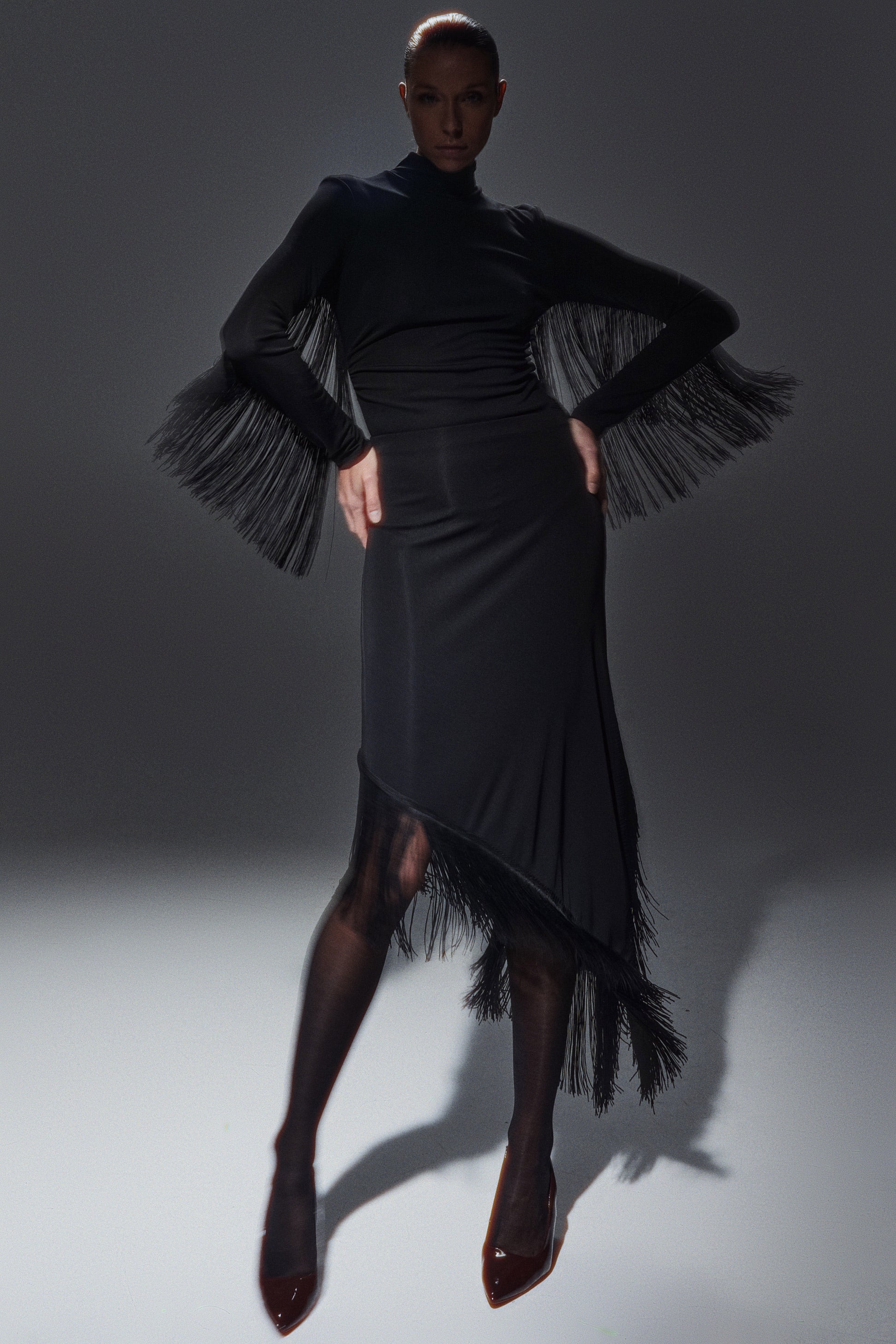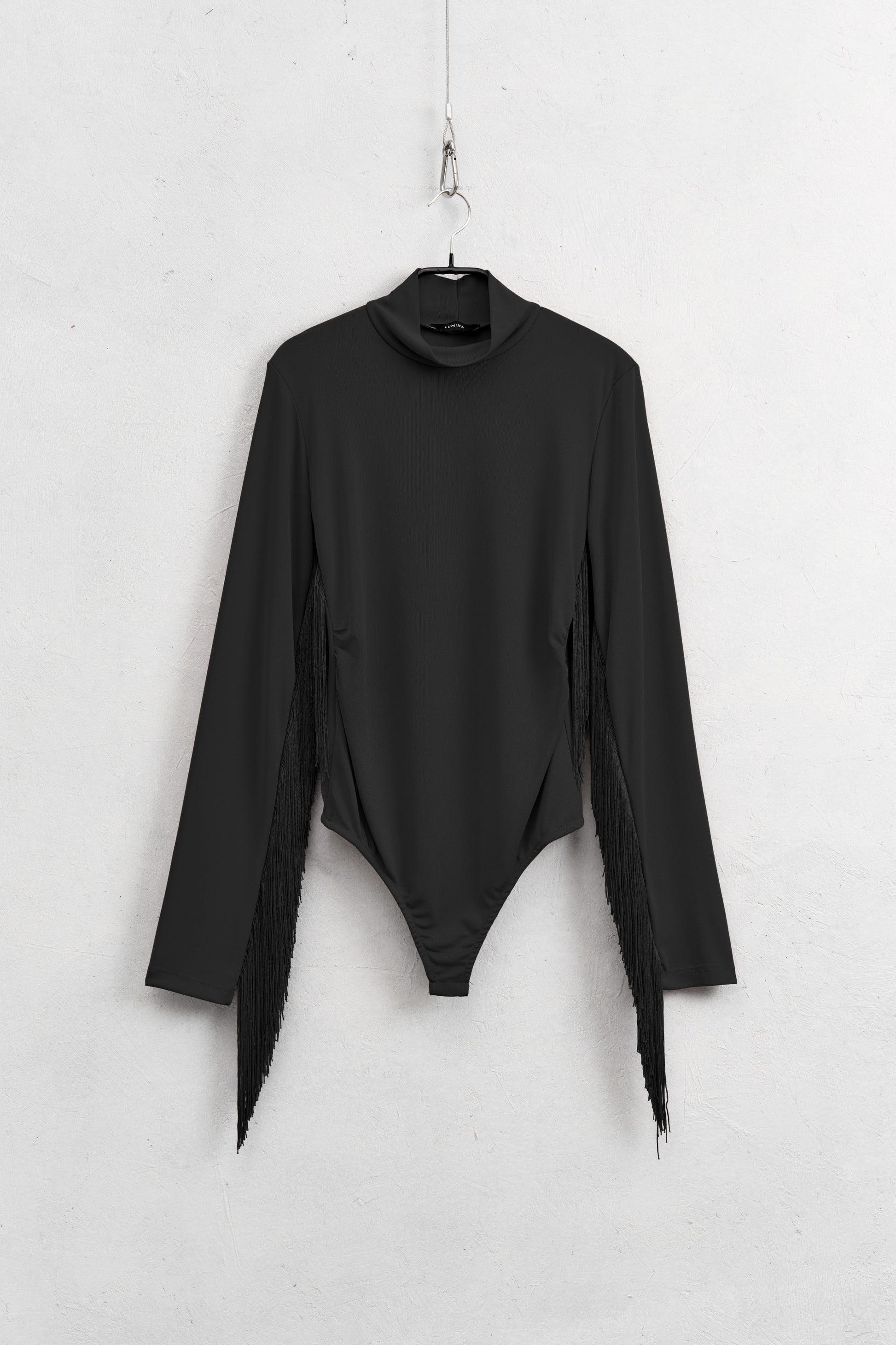 Body con collo alto. Dettaglio applicazione frange. Chiusura inferiore con bottoni. Vestibilità regolare, disponibile in taglia S/M, M/L.