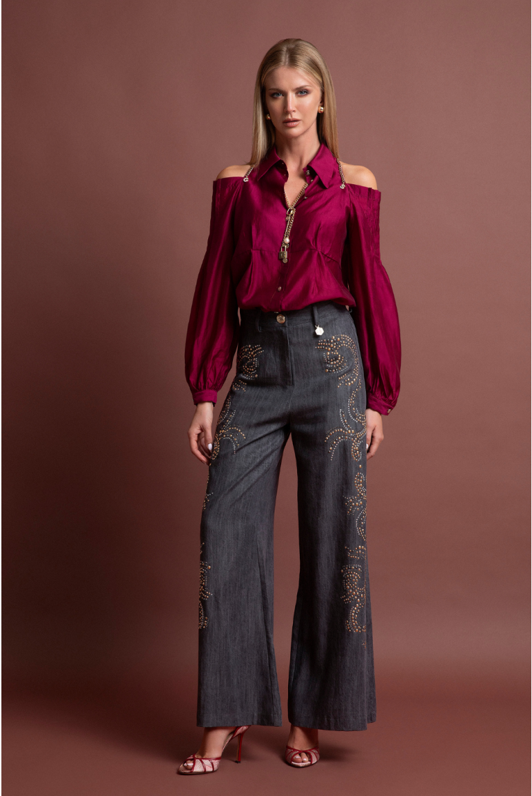 Jeans flare grigi con borchie oro-argento motivo fuochi d'artificio