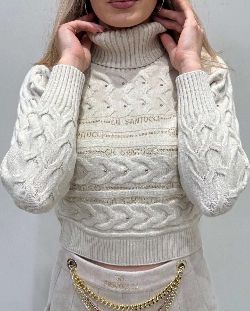 Maglione in maglia intrecciata con collo alto che offre calore e stile sofisticato. La trama intrecciata crea una texture visiva interessante, mentre il collo alto garantisce protezione dal freddo e un'estetica moderna e versatile. Perfetto per layering o indossato da solo, questo capo combina comfort e eleganza per un look raffinato in qualsiasi occasione.