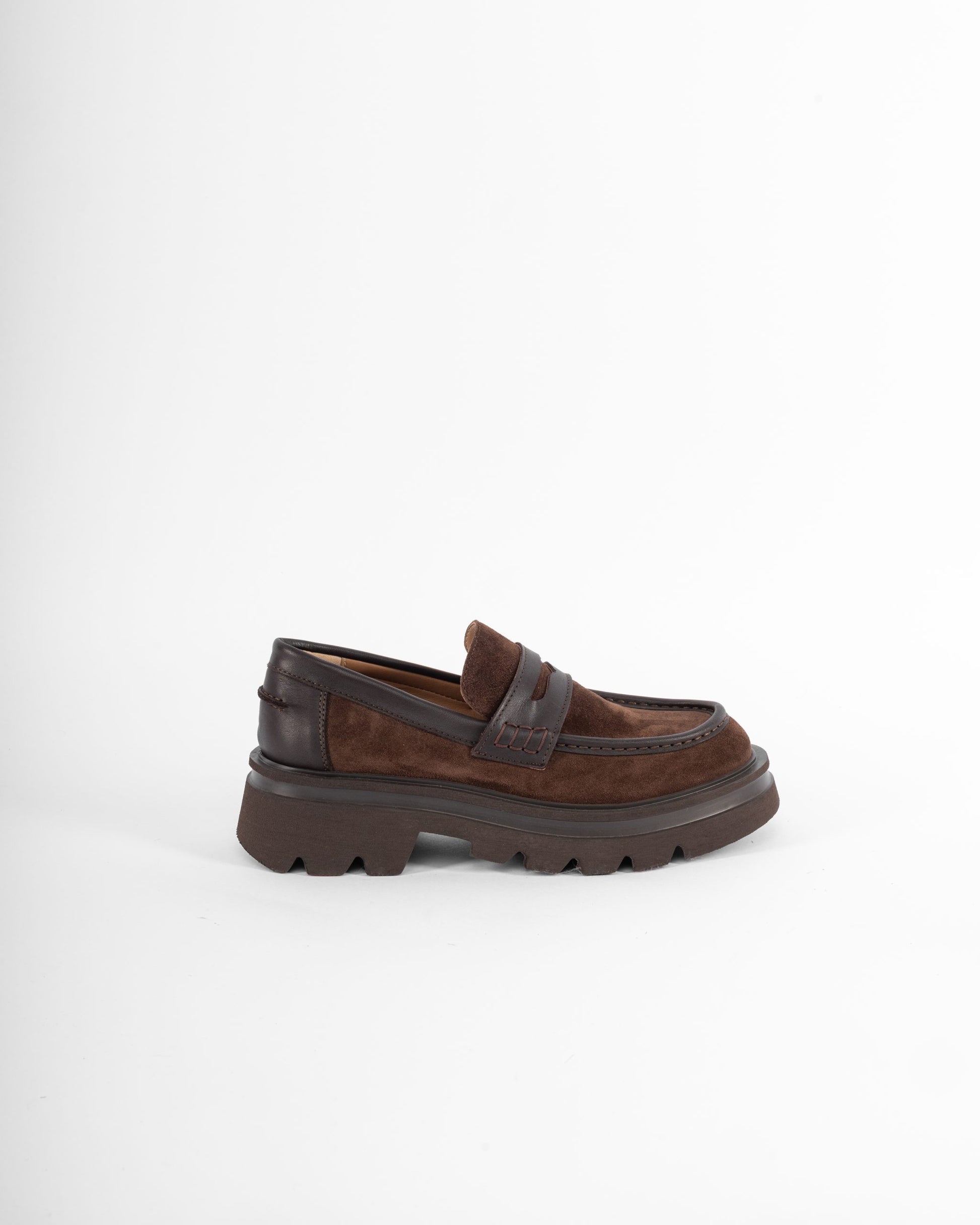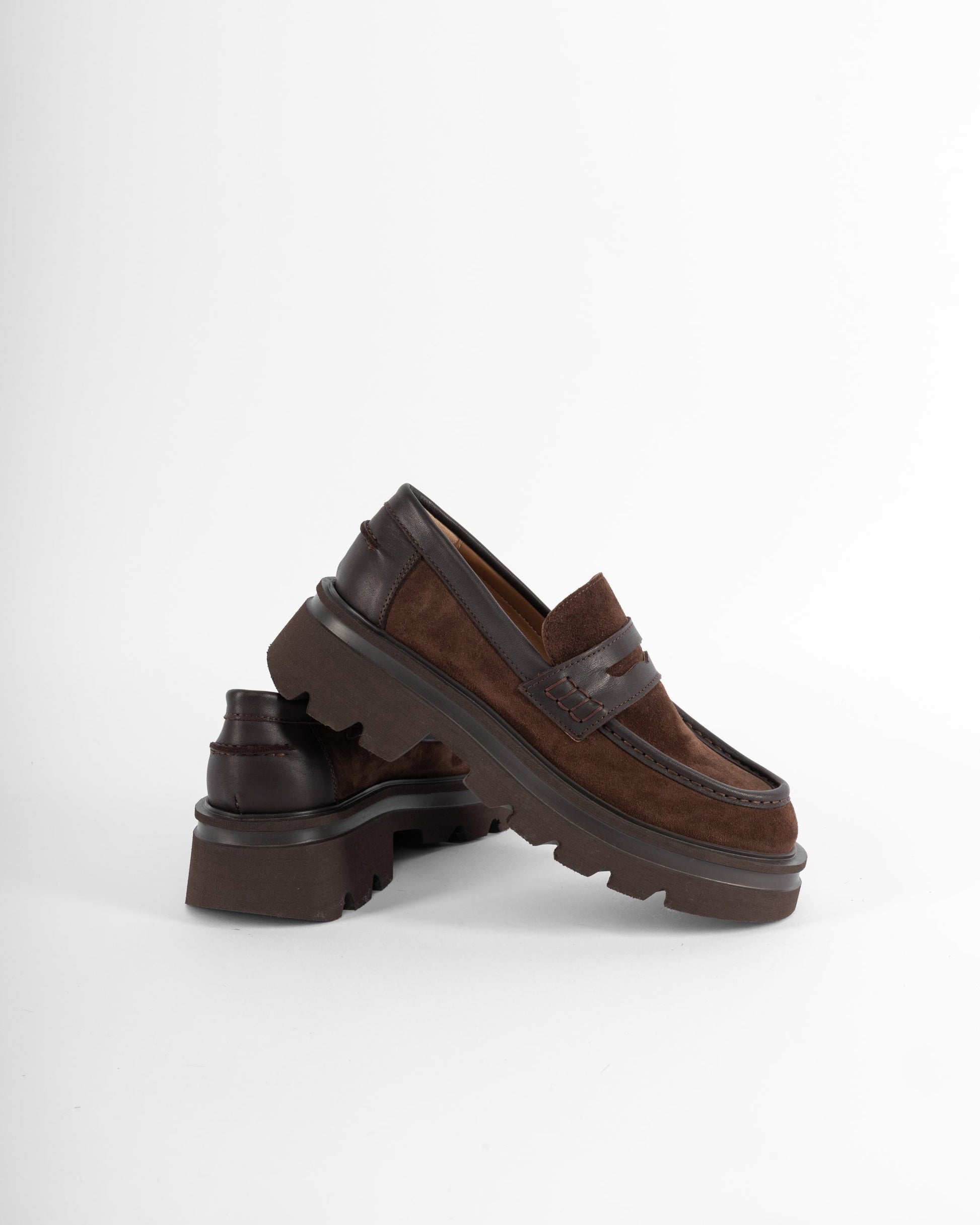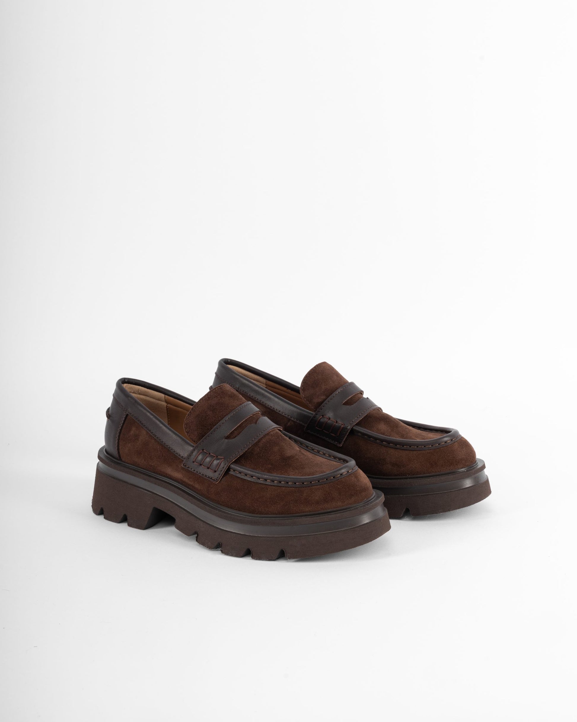 Dana è la scarpa che combina il morbido camoscio color cioccolato con dettagli in pelle di vitello per aggiungere un tocco elegante.