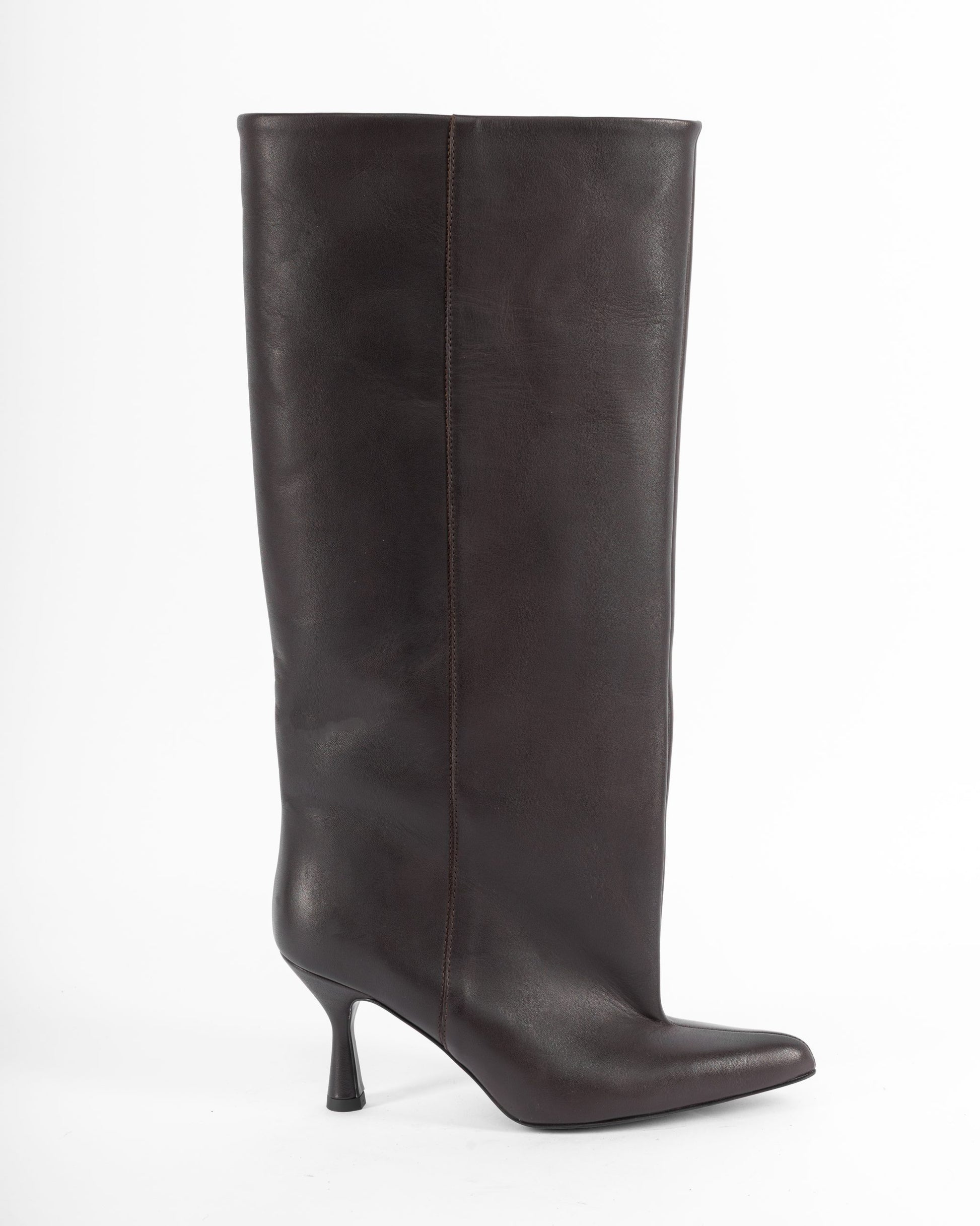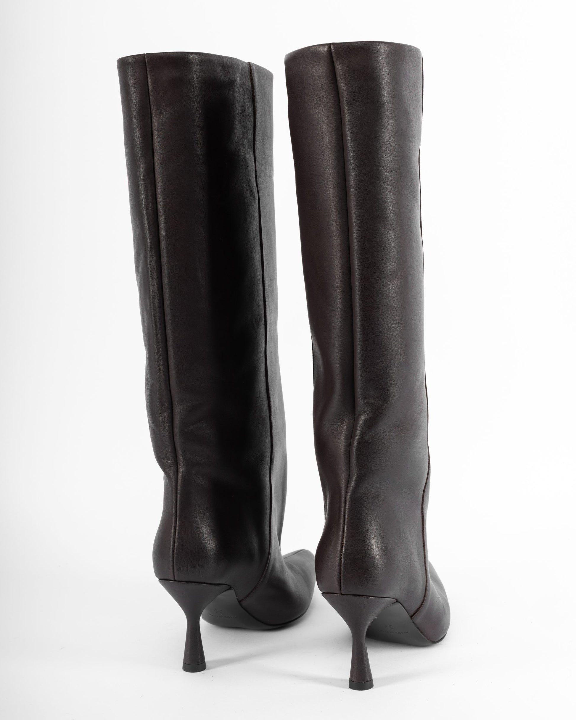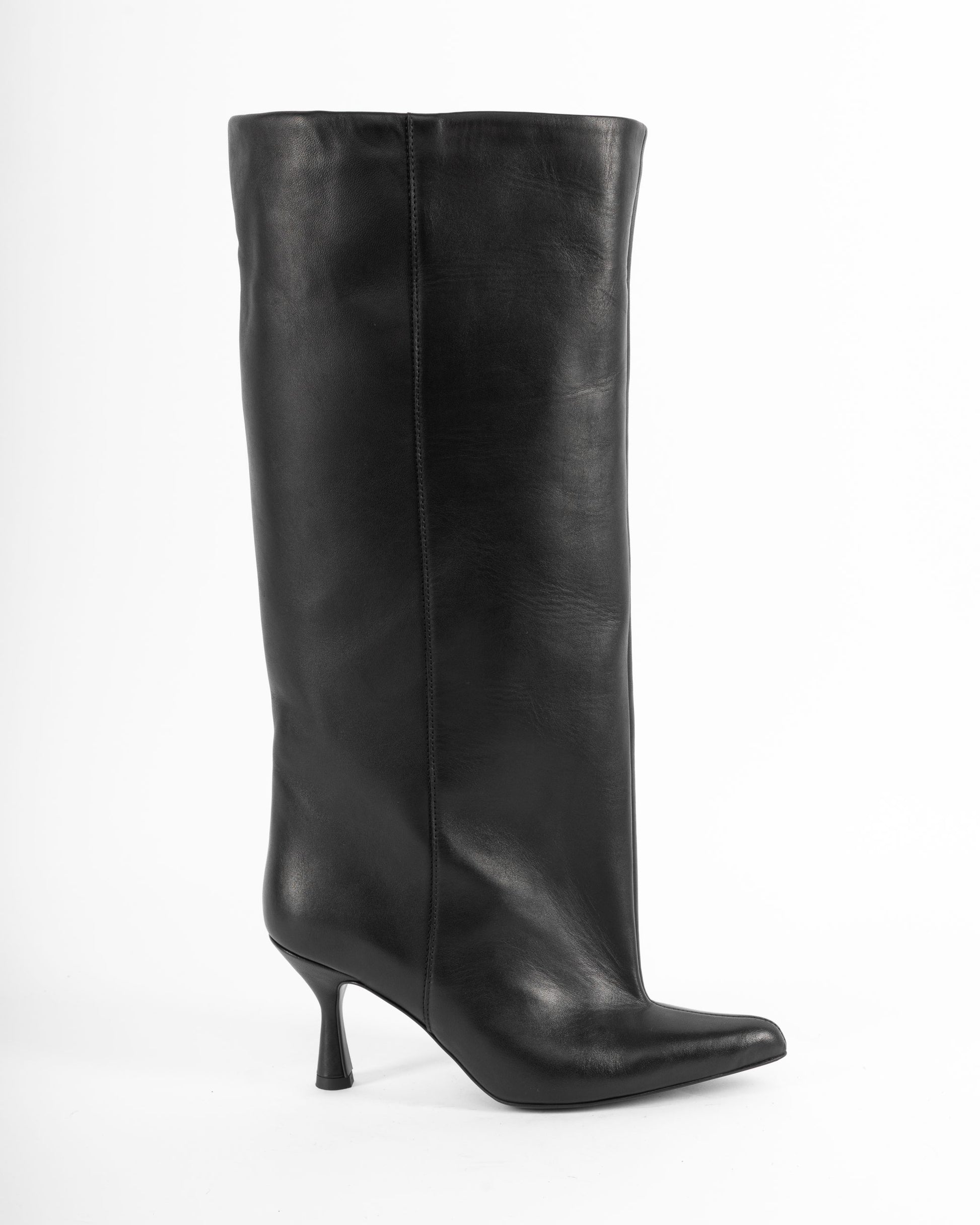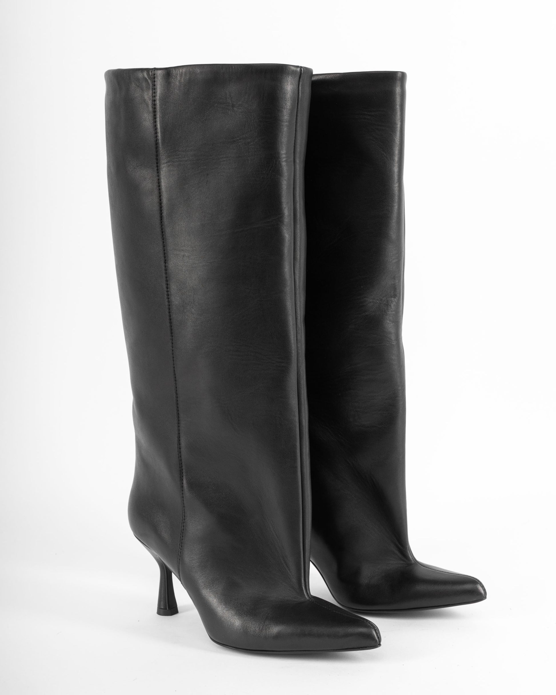 Realizzati in pelle di vitello nera, sono caratterizzati da un tacco leggermente svasato e da una gamba extra larga.