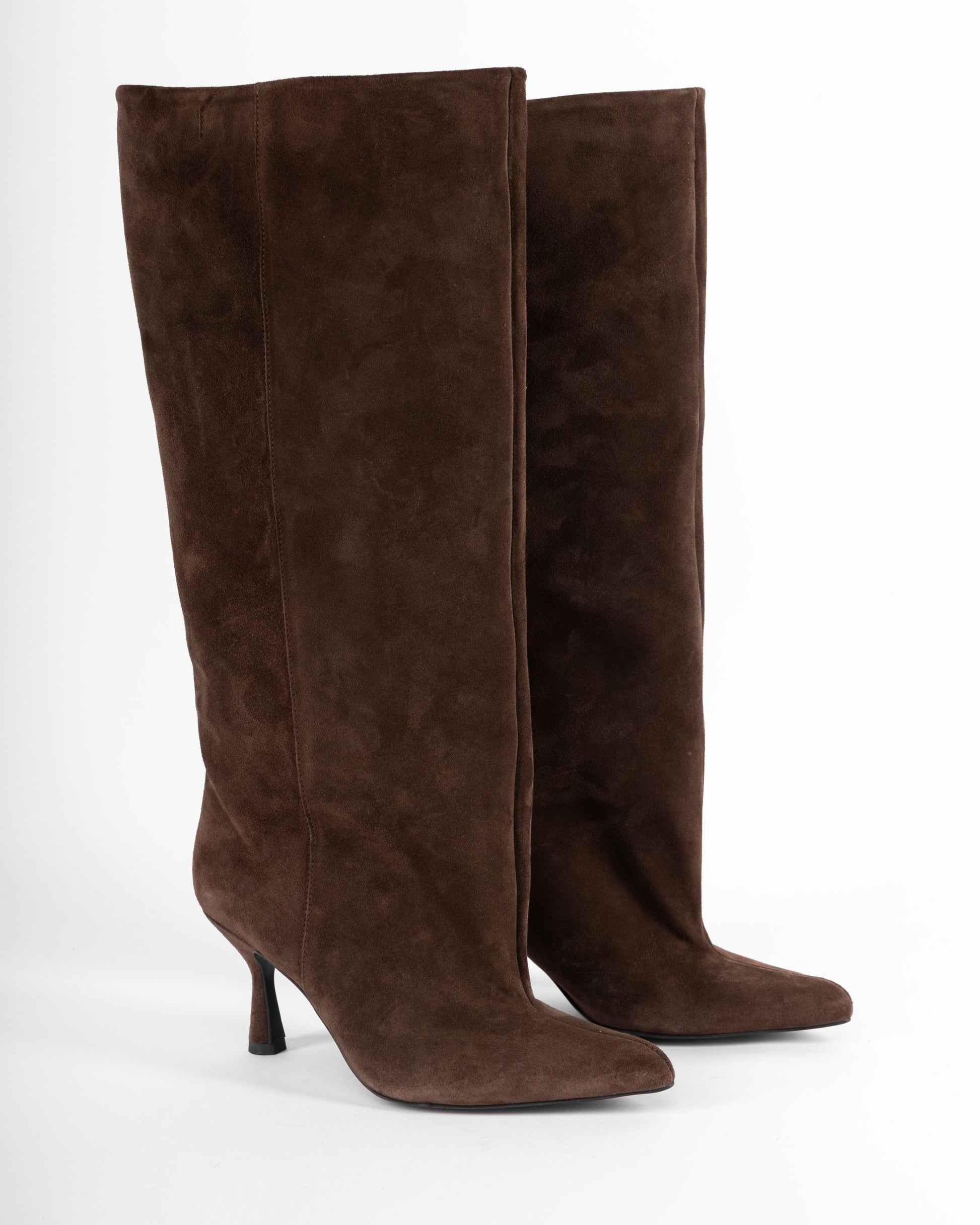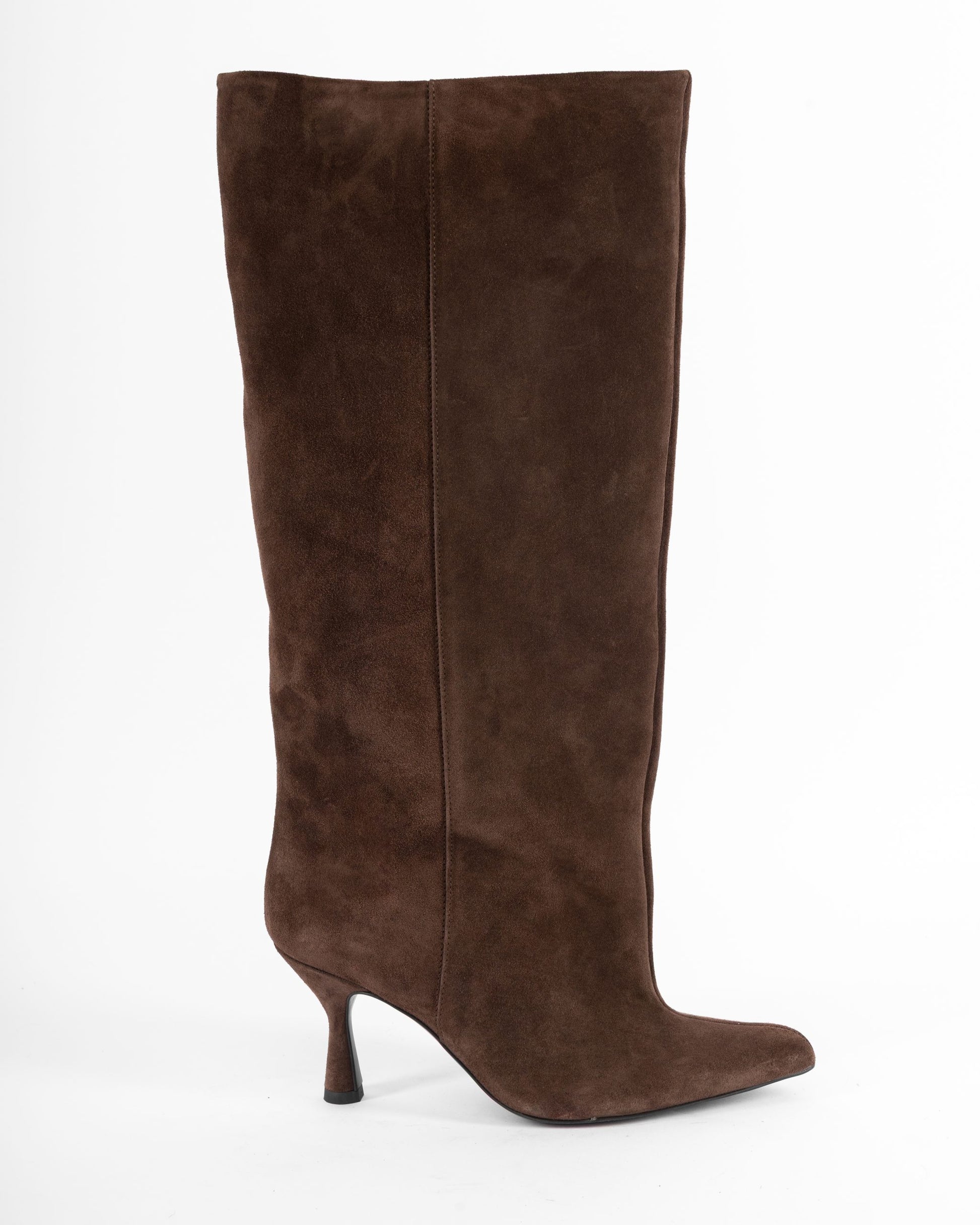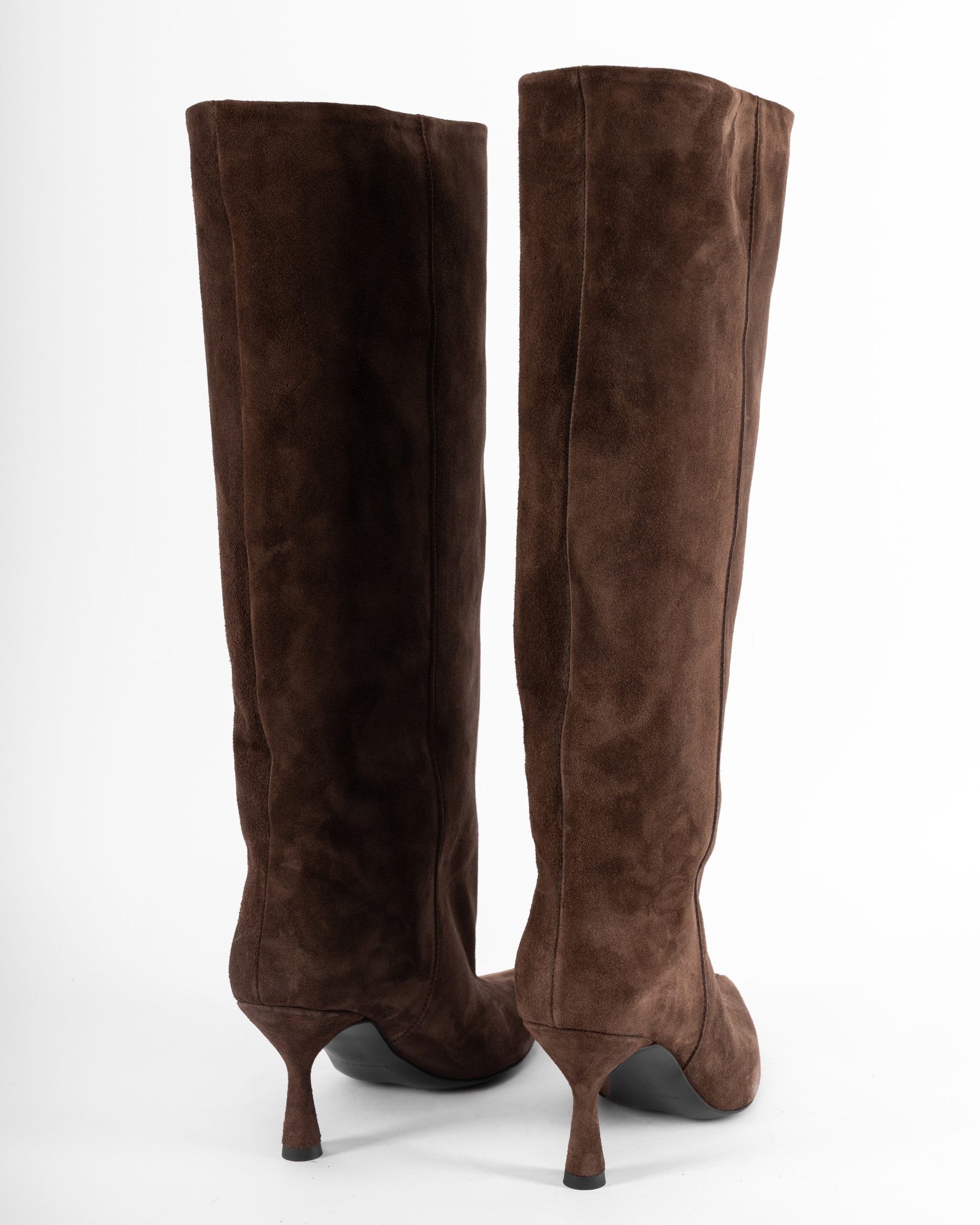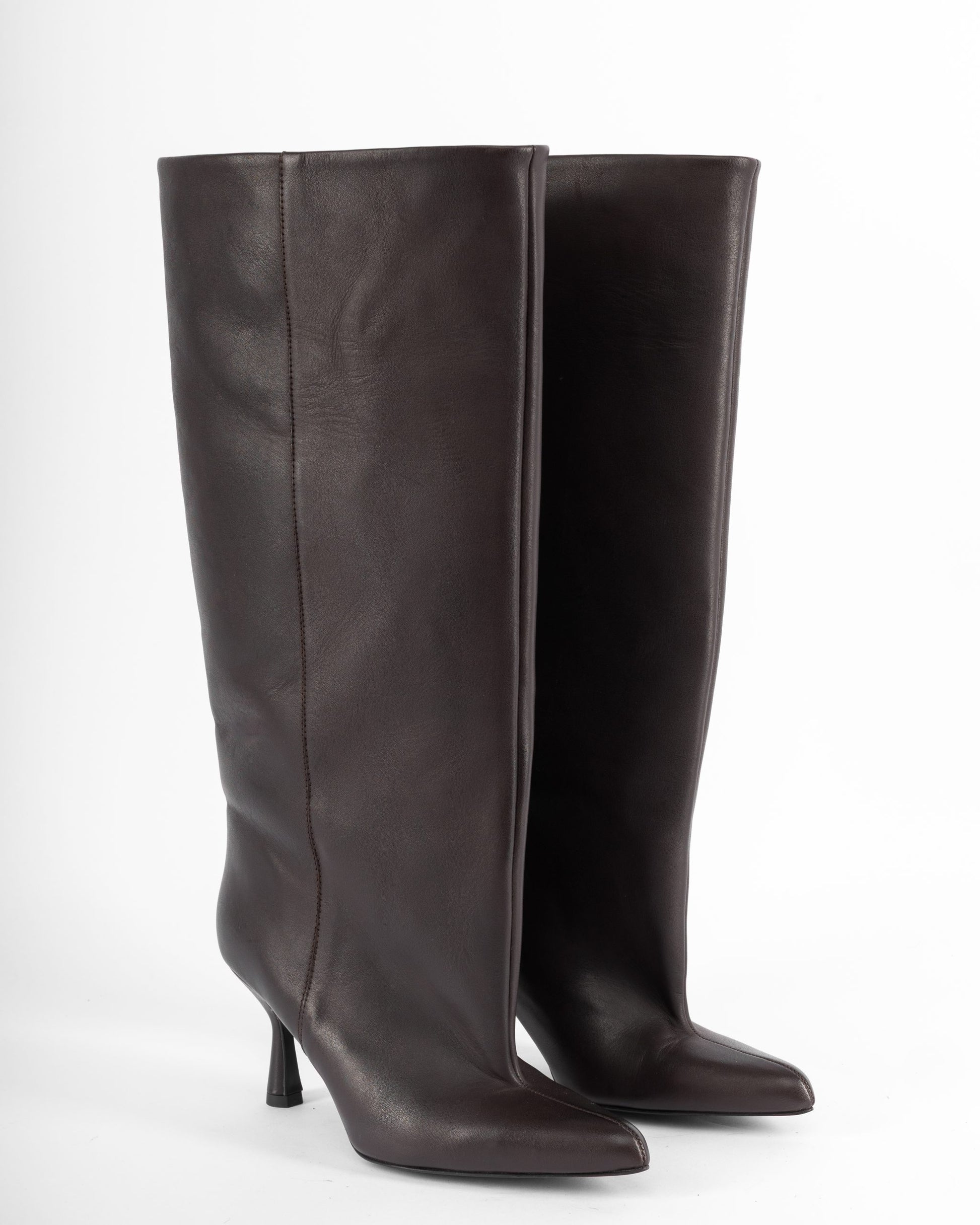 Realizzati in pelle di vitello nera, sono caratterizzati da un tacco leggermente svasato e da una gamba extra larga.